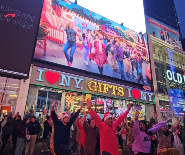 The promo for Christmas Karma lit up the video screen in Times Square ahead of its theatrical release. To celebrate, dancers from Masala Bhangra Group Fitness accompanied the premiere of the video in the heart of New York City with their special energetic moves and dhol player for a unique promotion.
