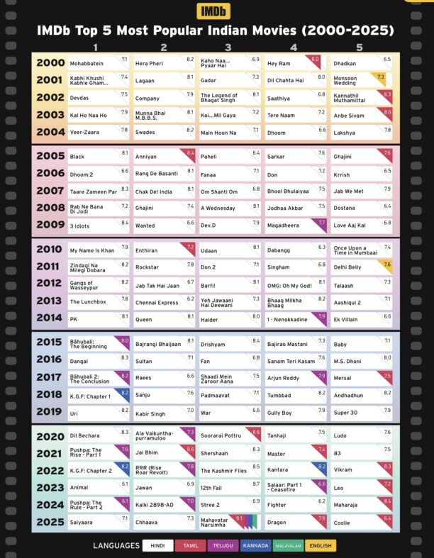 “The Indian film industry has always been cyclical, so this quarter century mark is a good vantage point to look forward and see what that evolution means for stories and storytellers in the years ahead,” said Yaminie Patodia, Head, IMDb India. “IMDb data offers a singular, global proxy for audience engagement, one that is neutral to platform, geography, and release window. This moment marks a coming of age for Indian cinema — one that embraces a richer tapestry of voices from across industries, driven by collaborations and diverse narrative styles. We are immensely proud to showcase Indian cinema’s representation across the world and look forward to its excellence being celebrated on screens globally.”