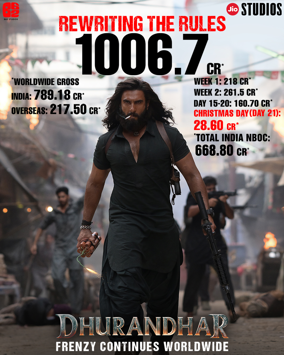 Closing its third week with emphatic authority, Jio Studios & B62 Studios’ Aditya Dhar-directed charges into the holiday period with unmatched momentum, firmly establishing Dhurandhar as one of the fastest and biggest global box-office successes in Indian cinema.
