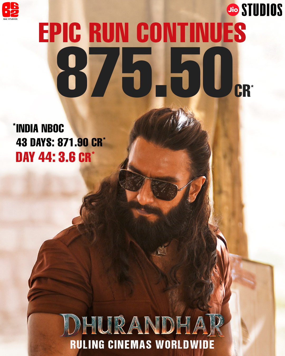 Fresh off rewriting every box-office benchmark in Week 6, Dhurandhar has now crossed yet another towering milestone, powering past ₹875 crore nett in India. On Saturday, Day 44, the film added ₹3.60 crore nett (India), taking its India total to ₹875.50 crore nett, crossing another historic milestone.