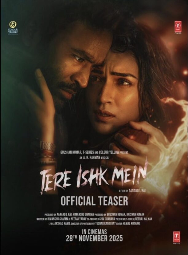 Gulshan Kumar, T-Series, and Colour Yellow present Tere Ishk Mein, produced by Aanand L Rai and Himanshu Sharma, produced by Bhushan Kumar and Krishan Kumar. The film directed by Aanand L Rai and written by Himanshu Sharma and Neeraj Yadav, is an A.R. Rahman musical with lyrics by Irshad Kamil. Starring Dhanush and Kriti Sanon, the film is scheduled to release worldwide in Hindi and Tamil on 28th November 2025.