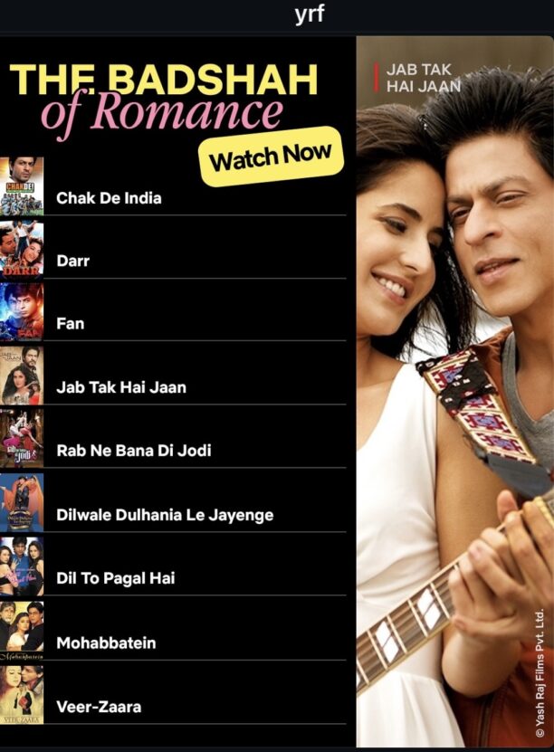 The partnership gives access to a curated line-up of YRF films that will roll out in phases to celebrate special occasions, festivals and beloved cinematic moments – offering fans across the globe the chance to watch their favourite films at home. Celebrating the King of Bollywood, nine of Shah Rukh Khan’s most memorable films, including Dilwale Dulhania Le Jayenge, Mohabbatein, Dil To Pagal Hai, Veer-Zaara, and Chak De India will launch on November 1, his birthday weekend.