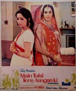 The first fifteen minutes of Raj Khosla’s Main Tulsi Tere Aangan Ki (1978), a lengthy rambling but successful melodrama, contains Nutan at her best. She is a woman openly jealous of her husband’s mistress, Asha Parekh. Later, when the Other Woman dies, Nutan brings up her husband’s illegitimate child as her own. Standing tall, much taller than the film, Nutan delivered a rousing performance.